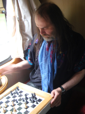 Das war vor fast zehn Jahren. Nun aber saßen unsere Helden bereit, auf der Brockenfahrt den Spaß ins Maximale auszuweiten! Selbstredend sollten dafür einige Partien gespielt werden. Schachspieler sind davon ja sowieso nicht abzuhalten. Passend zum Donnerwetter sollte es natürlich Blitz-Schach sein. Das ist aber in einem ruckelnden und schaukelnden Gefährt, das zumindest den Beginn "des gefürchteten Gebirgsmassiva" bezwingen soll, gar nicht so einfach!