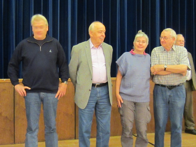 Ralf Schöngart (SF Buxtehude), Gerhard Bünger (SK Norderstedt v. 1975) und Monika & Manfred Mädler, die zusammen den Schachstand betreuen.