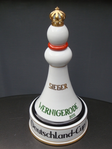 Eröffnet wird das Turnier am Dienstag. Das geschieht durch den Vizepräsidenten des Deutschen Schachbundes Michael Woltmann zusammen mit dem Präsidenten des Landesschachverbandes Sachsen-Anhalt, Dr. Günter Reinemann und durch Turnierdirektor und Conférencier Dr. Dirk Jordan. Beendet wird das Turnier im Rathaus Wernigerode durch die Siegerehrung, die vom Präsidenten des Deutschen Schachbundes, Herbert Bastian, vorgenommen werden wird, an dessen Seite der Vizepräsident des Deutschen Schachbundes, Michael S. Langer stehen wird. In ihrer Mitte befindet sich an diesem Tag der stellvertretende Oberbürgermeister von Wernigerode, nämlich Bürgermeister Andreas Heinrich, auf den wir uns ganz besonders freuen. Diese drei werden jedem Sieger einer Gruppe je einen der wunderschönen Pokale der "Dresdner Porzellanmanufaktur" übergeben. Jedes dieser Kunstwerke hat einen Wert von rund 400,-- Euro; so was hat ja nun nicht jeder zu Hause stehen.