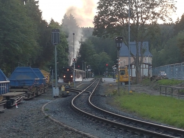 "Ziel sind die Steinerne Renne, die Mönchsbuche und die Himmelpforte. Insgesamt waren es bis auf den Marktplatz von Wernigerode 15 km (ca. 4 Stunden)." Wie - fährt da kein Taxi? Verblüffenderweise aber sandte unser Himmelspforten-Stürmer bald auch ein Foto der Harzer Schmalspurbahn, die am schon dunkelnden Nachmittag schier(ke) unaufhaltsam durch das atemberaubende Geflecht der zwei Gleisspuren dieser verkehrlichen Schaltzentrale dampft - es geht also auch anders als zu Fuß!