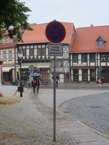 Danach ging's für die Gruppe noch ins Schiefe Haus; von umgefallenen Spielern muss zum Glück hier nicht berichtet werden. Erheiterte Beachtung fand noch das Straßenschild am Platz vor dem Schiefen Haus (siehe Foto) "Halteverbot außer für Pferdegespanne". (Heike Wöst)