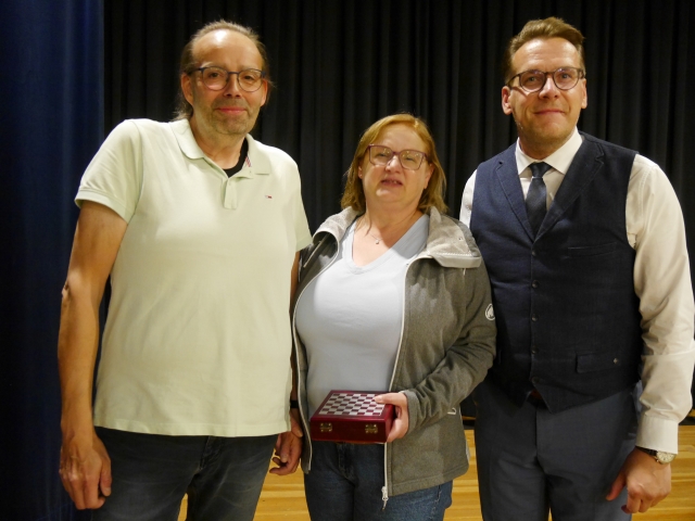 Viele Schachveranstaltungen ehren verdiente Spieler oder feiern Jubiläen. Aber das, was folgt, kann wohl kaum ein Turnier vorweisen: Denn mit Beatrix & Christoph Wolff betritt – bejubelt von allen Anwesenden – ein veritables Hochzeitspaar die Bühne! Vormittags noch zur Trauung im Wernigeröder Rathaus, lassen sie es sich am Nachmittag nicht nehmen, gemeinsam zum Turnierstart im Saal des HKK-Hotels zu erscheinen. Mit einer persönlichen Gratulation durch den Oberbürgermeister hatten sie wohl nicht gerechnet. Tobias Kascha überreicht unter anhaltendem Applaus eine Holz-Box mit Schachbrett auf dem Deckel. Das Besondere: Im Inneren verbergen sich nicht nur die Figuren, sondern dazu noch ein hochwertiges Korkenzieher-Set.