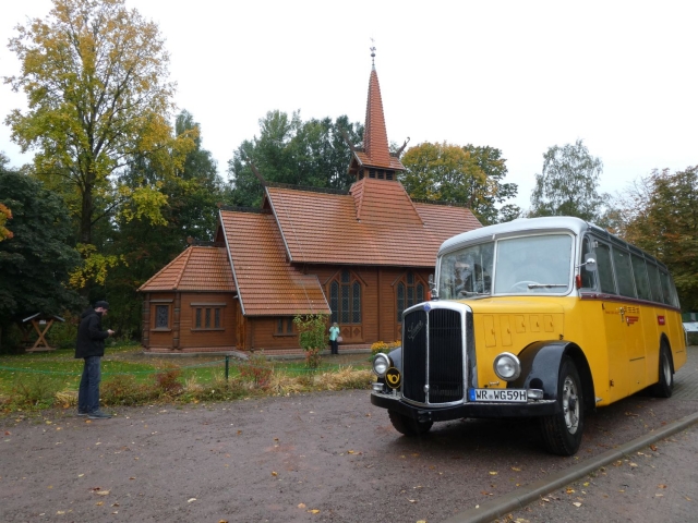 Bestens informiert durch die Erklärungen von Gästeführerin Ilona Sewohl ging es im alten Schnauferl nach Stiege, um die Stabkirche zu besichtigen. Diese war 1904 an einer Lungenheilstätte im Harz gebaut worden. Nachdem das Sanatorium 1993 geschlossen worden war, wurde die einsame Kapelle im Wald zum Lost Place, und war besonders ab 2011 intensiver Zerstörung durch Vandalismus ausgesetzt. Ein Großbrand zerstörte zwei Jahre später die Reste des Lungensanatoriums, verschonte aber glücklicherweise die Kapelle.