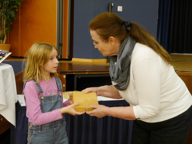 Der Sieger beim Preisrätsel des Tages wurde vor Runde 5 ausgelost. Wegen der vielen Byes galt ausnahmsweise, dass man nicht anwesend sein musste, um den Preis zu erhalten. Meeri Ruddat aus Gruppe 12 freute sich, ein Reiseschachspiel für Papa Mathias imit nach Hause zu nehmen.