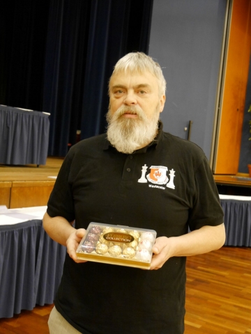Offenbar hatte sich unter den Spielern und Begleitern herumgesprochen, dass Ingrid und Hugo Schulz sich aus dem Org-Team zurückzuziehen. Daher ließen es sich Bettina Baumann und Frank Erdmann – unter anhaltendem Applaus – nicht nehmen, sich mit herzlichen Worten und einem Präsentkorb für den langjährigen Einsatz zu bedanken.