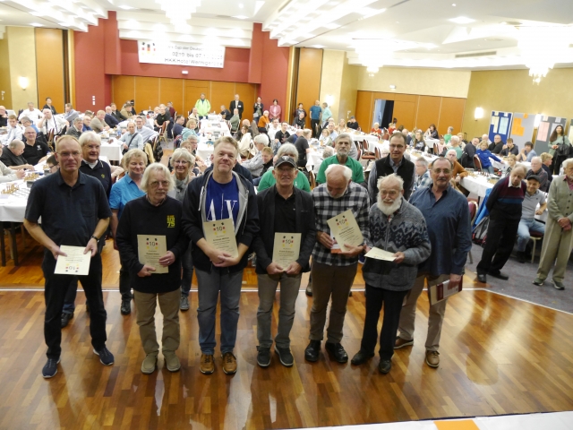 Auch das Ereignis des Tages, die Ehrung der neuen „Langjährigen“, wurde im Film festgehalten. Immerhin sind inzwischen 38 Spieler – die Neuen eingeschlossen – zehnmal oder mehr nach Wernigerode gereist, um Schach zu spielen und parallel am Rahmenprogramm teilzunehmen oder Zeit mit der Familie zu genießen. Zunächst bat Dr. Jordan alle anwesenden mit 11 oder mehr Teilnahmen, aufzustehen, und während er die Namen vorlas, erhoben sich beeindruckende 22 Personen.